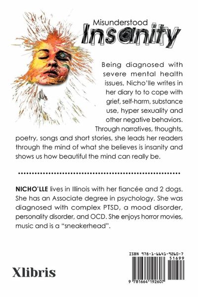 Being diagnosed with severe mental health issues, Nicho'lle writes in her diary to to cope with grief, self-harm, substance use, hyper sexuality and other negative behaviors. Through narratives, thoughts, poetry, songs and short stories, she leads her readers through the mind of what she believes is insanity and shows us how beautiful the mind can really be.
