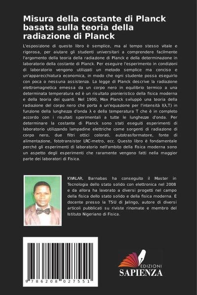 L'esposizione di questo libro è semplice, ma al tempo stesso vitale e rigorosa, per aiutare gli studenti universitari a comprendere facilmente l'argomento della teoria della radiazione di Planck e della determinazione in laboratorio della costante di Planck. Per eseguire l'esperimento in condizioni di laboratorio vengono utilizzati un metodo semplice ma conciso e un'apparecchiatura economica, in modo che ogni studente possa eseguirlo con poca o nessuna assistenza. La legge di Planck descrive la radiazione elettromagnetica emessa da un corpo nero in equilibrio termico a una determinata temperatura ed è un risultato pionieristico della fisica moderna e della teoria dei quanti. Nel 1900, Max Planck sviluppò una teoria della radiazione del corpo nero che porta a un'equazione per l'intensità I(¿,T) in funzione della lunghezza d'onda ¿ e della temperatura T che è in completo accordo con i risultati sperimentali a tutte le lunghezze d'onda. Per determinare la costante di Planck sono stati eseguiti esperimenti di laboratorio utilizzando lampadine elettriche come sorgenti di radiazione di corpo nero, due filtri ottici colorati, autotrasformatore, fonte di alimentazione, fototransistor LRC-metro, ecc. Questo libro è fondamentale perché gli esperimenti di laboratorio nell'ambito della Fisica moderna sono un aspetto degli esperimenti che raramente vengono fatti nella maggior parte dei laboratori di Fisica.