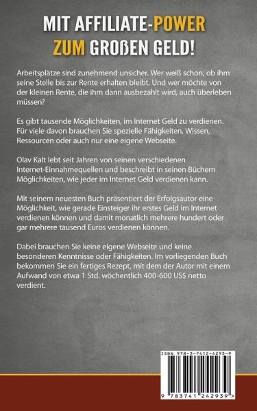Arbeitsplätze sind zunehmend unsicher. Wer weiß schon, ob ihm seine Stelle bis zur Rente erhalten bleibt. Und wer möchte von der kleinen Rente, die ihm dann ausbezahlt wird, auch überleben müssen?Es gibt tausende Möglichkeiten, im Internet Geld zu verdienen. Für viele davon brauchen Sie spezielle Fähigkeiten, Wissen, Ressourcen oder auch nur eine eigene Webseite.Olav Kalt lebt seit Jahren von seinen verschiedenen Internet-Einnahmequellen und beschreibt in seinen Büchern Möglichkeiten, wie jeder im Internet Geld verdienen kann. Mit seinem neuesten Buch präsentiert der Erfolgsautor eine Möglichkeit, wie gerade Einsteiger ihr erstes Geld im Internet verdienen können und damit monatlich mehrere hundert oder gar mehrere tausend Euros verdienen können. Dabei brauchen Sie keine eigene Webseite und keine besonderen Kenntnisse oder Fähigkeiten. Im vorliegenden Buch bekommen Sie ein fertiges Rezept, mit dem der Autor mit einem Aufwand von etwa 1 Std. wöchentlich 400-600 US$ netto verdient.