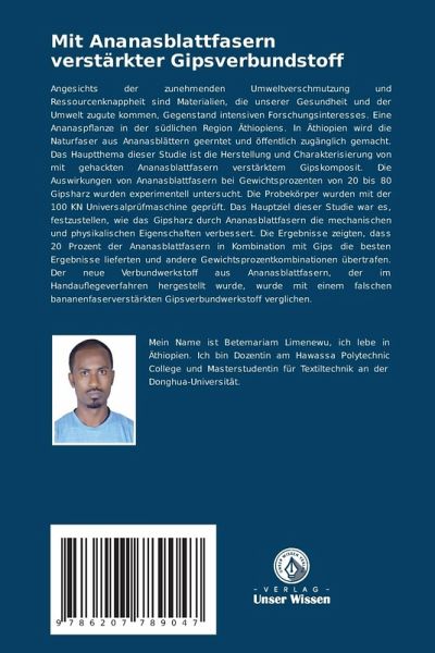 Angesichts der zunehmenden Umweltverschmutzung und Ressourcenknappheit sind Materialien, die unserer Gesundheit und der Umwelt zugute kommen, Gegenstand intensiven Forschungsinteresses. Eine Ananaspflanze in der südlichen Region Äthiopiens. In Äthiopien wird die Naturfaser aus Ananasblättern geerntet und öffentlich zugänglich gemacht. Das Hauptthema dieser Studie ist die Herstellung und Charakterisierung von mit gehackten Ananasblattfasern verstärktem Gipskomposit. Die Auswirkungen von Ananasblattfasern bei Gewichtsprozenten von 20 bis 80 Gipsharz wurden experimentell untersucht. Die Probekörper wurden mit der 100 KN Universalprüfmaschine geprüft. Das Hauptziel dieser Studie war es, festzustellen, wie das Gipsharz durch Ananasblattfasern die mechanischen und physikalischen Eigenschaften verbessert. Die Ergebnisse zeigten, dass 20 Prozent der Ananasblattfasern in Kombination mit Gips die besten Ergebnisse lieferten und andere Gewichtsprozentkombinationen übertrafen. Der neue Verbundwerkstoff aus Ananasblattfasern, der im Handauflegeverfahren hergestellt wurde, wurde mit einem falschen bananenfaserverstärkten Gipsverbundwerkstoff verglichen.