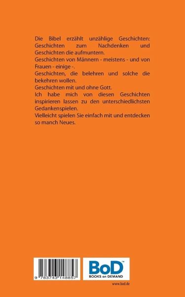 Die Bibel erzählt unzählige Geschichten: Geschichten zum Nachdenken und Geschichten die aufmuntern. Geschichten von Männern - meistens - und von Frauen - einige Geschichten, die belehren und solche die bekehren wollen. Geschichten mit und ohne Gott. Ich habe mich von diesen Geschichten inspirieren lassen zu den unterschiedlichsten Gedankenspielen. Vielleicht spielen Sie einfach mit und entdecken so manch Neues.