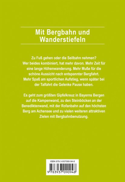 Zu Fuß gehen oder die Seilbahn nehmen? Wer beides kombiniert, hat mehr davon. Mehr Zeit für eine lange Höhenwanderung. Mehr Muße für die schöne Aussicht nach entspannter Bergfahrt. Mehr Spaß am sportlichen Aufstieg, wenn später bei der Talfahrt die Gelenke Pause haben. Es geht zum größten Gipfelkreuz in Bayerns Bergen auf die Kampenwand, zu den Steinböcken an der Benediktenwand, mit der Rofanbahn auf den höchsten Berg am Achensee, mit der Karwendelbahn zum "begehbaren Fernrohr" und zu vielen weiteren attraktiven Zielen mit Bergbahnbenutzung.