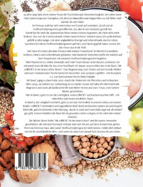 Ein Stoffwechselprogramm erobert die Welt. September 2012 brachte Joachim Heberlein dieses fantastische Konzept nach Deutschland und von hier hat es seinen Siegeszug um die Welt angetreten. Weit über eine Million zufriedener Anwender, tagtägliche begeisterte Berichte und dieses dahinterstehende Lebensgefühl begeistern mich seit inzwischen über 6 Jahren. Dieses Buch ist Band 4, angefühlt mit Rezepten für die bekannte Küchenmaschine und ihre Brüder. Hintergrundinformationen und alles passgenau für die Umsetzung des Stoffwechselprogramms cellRESET ausgelegt. Heute hältst du also Band 4 in den Händen, der dir die Leichtigkeit und Einfachheit von cellRESET mit gängigen Küchenmaschinen näher bringt. Dies hier ist mein persönliches Jubiläumsbuch zu meinem 50. Geburtstag und gleichzeitig zu meinem 6. Geburtstag seit Beginn meines neuen Lebens. Die Basis für dieses Buch ist unser Stoffwechselprogramm cellRESET. Daher ist dieses Buch für Anwender gedacht, die mit uns auf diese Körperreise gehen. Solltest du unser Stoffwechselprogramm nicht kennen, wende dich bitte an mich, denn das dahinterstehende Konzept ist die Basis und der Garant für deinen Erfolg mit diesem Buch.