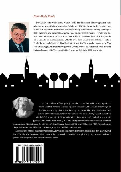Die Dackeldame Céline geht jeden Abend mit ihrem Herrchen spazieren und berichtet darüber in ihrer eigenen Kolumne "Mit Céline unterwegs" in der Wochenzeitung "DZ - Die Zeitung" in Uetze (Niedersachsen)über ihre Erlebnisse. Mal gibt es etwas Heiteres, mal etwas sehr Ernstes oder Trauriges, mal nimmt sie die Behörden auf die Schippe (ein Vierbeiner kann und darf alles sagen, ein großer Zweibeiner aber nicht!) und mal bringt sie auch einen Leserbrief, meistens von anderen Vierbeinern, die etwas auf dem Herzen haben. 2002 war Céline im NDR-Fernsehen als "Reporterin auf vier Pfötchen" unterwegs - auch darüber berichtet sie.Diese Buch enthält eine unterhaltsame Auswahl an Berichten mit vielen Bildern, die für Groß und Klein zum Selberlesen oder zum Vorlesen gleich geeignet sind. Und nach jedem Bericht gibt es ein Küßchen von Céline.