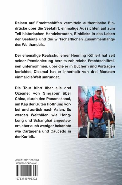 Reisen auf Frachtschiffen vermitteln authentische Eindrücke über die Seefahrt, einmalige Aussichten auf zum Teil historischen Handelsrouten, Einblicke in das Leben der Seeleute und die wirtschaftlichen Zusammenhänge des Welthandels. Der ehemalige Realschullehrer Henning Köhlert hat seit seiner Pensionierung bereits zahlreiche Frachtschiffreisen unternommen, über die er in Büchern und Vorträgen berichtet. Diesmal hat er innerhalb von drei Monaten einmal die Welt umrundet. Die Tour führt über alle drei Ozeane: von Singapur über China, durch den Panamakanal, am Kap der Guten Hoffnung vorbei und zurück nach Asien. Es werden Welthäfen wie Hongkong und Schanghai angesteuert, aber auch weniger bekannte wie Cartagena und Caucedo in der Karibik.
