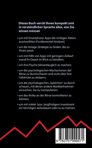 Dieses Buch richtet sich an Börsen-Einsteiger, die nicht länger ihre Geldanlage anderen überlassen wollen. Der Autor verfasste es in der Überzeugung, dass nur jemand, der schwierige Zusammenhänge wirklich verstanden hat, in der Lage ist, sein Wissen kompakt und verständlich darzustellen. "In der Kürze liegt die Würze".Dieses Buch verzichtet bewusst auf eine "wissenschaftliche Durchdringung", auf eine "aufgeblähte" Darstellung der Sachverhalte auf zu vielen Seiten. Es informiert Sie über die psychologischen Gesetze der Börse genauso wie über die Technische Analyse und das Spiel von Bären und Bullen.Der Autor nimmt Sie an der Hand und macht Sie in kurzer Zeit und in wenigen Schritten zum Börsen-Profi. Beispielsweise zeigt er Ihnen, wie Sie mit Hilfe von Apps die richtigen Aktien auswählen, wie Sie mir nur wenigen Apps den Überblick über das Geschehen an der Börse behalten und entsprechend schnell reagieren können. Er macht Sie vertraut mit unterschiedlichen Anlagestrategien, ihren Stärken und Schwächen. Er zeigt Ihnen, welche Strategie am besten zu Ihnen passt und wie Apps Ihnen dabei helfen können, die gewählte Strategie umzusetzen. Aus mindestens der Hälfte der Buchkapitel könnte man ein eigenes Buch machen. Aber wem soll das nützen? Mehr als das hier Zusammengefasste müssen Sie nicht wissen, um an der Börse erfolgreich zu sein.