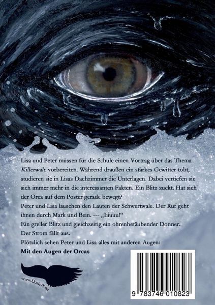 Lisa und Peter müssen für die Schule einen Vortrag über das Thema Killerwale vorbereiten. Während draußen ein starkes Gewitter tobt, studieren sie in Lisas Dachzimmer die Unterlagen. Dabei vertiefen sie sich immer mehr in die interessanten Fakten. Ein Blitz zuckt. Hat sich der Orca auf dem Poster gerade bewegt? Peter und Lisa lauschen den Lauten der Schwertwale. Der Ruf geht ihnen durch Mark und Bein. "Iiiuuu!"Ein greller Blitz und gleichzeitig ein ohrenbetäubender Donner. Der Strom fällt aus. Plötzlich sehen Peter und Lisa alles mit anderen Augen: Mit den Augen der Orcas!Ein spannender und ergreifender Roman über die Nördlich Residenten Orcas, die bei Vancouver Island/Kanada leben. Basierend auf intensiven Recherchen taucht der Leser auf eine ganz besondere Weise in die Welt der Orcas ein, ganz so, als wäre er selber ein Mitglied der Orca-Familie. Ausschnitt aus dem Vorwort von Dr. Paul Spong und Helena Symonds vom OrcaLab auf Hanson Island:"Selbst für diejenigen, die die Naturlieben, scheint es noch zu häufig eine Barriere zu geben, die uns daran hindert, die wilden Wesen der Natur vollkommen zu verstehen. Nur in unserer Fantasie können wir auf die andere Seite reisen. Durch ihre bezaubernde Geschichte 'Mit den Augen der Orcas' gibt uns Doris Thomas die seltene Gelegenheit, eine Zeit lang die Welt der Orcas zu erleben."