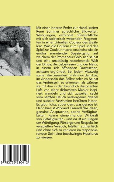 Mit einer inneren Feder zur Hand, kreiert René Sommer sprachliche Bildwelten, Wendungen, verbindet offensichtliche mit sich spielerisch webenden Fragmenten in einer virtuellen Couleur des Erzählens. Was die Couleur zum Spiel und das Spiel zur Couleur macht, erscheint wie ein endlos anmutender Spaziergang, auf welchem der Promeneur Golo sich selbst und eine unablässig resonierende Welt der Dinge, der Lebewesen und der Natur, in einem sich öffnenden Dazwischen, achtsam ergründet. Bei jedem Abzweig stehen die Lesenden mit ihm vor dem Los, im Anderssein das Selbst oder im Selbst das Anderssein zu erkennen, als würden sie mit ihm in der freundlich dissonanten Luft, von einer diskursiven Manier inspiriert, wandeln und sich zuweilen sacht vom sanften Hauch verborgener Zweifel und subtiler Faszination berühren lassen. Es gibt nichts, ausser dem, was gerade ist. Denn hier ist Wirkland. Freundliche Ideen, genuine Ansprachen, aparte Verfügbarkeiten, Keime einnehmender Wirkkraft von Gefälligkeiten - und da ist ein Ringen um Würdigung, Fürsorge und Respekt, im verspielten Versuch, letztlich authentisch und ohne sich zu verlieren im respondierenden Sein eine beschwingte Herzkurve zu kriegen.