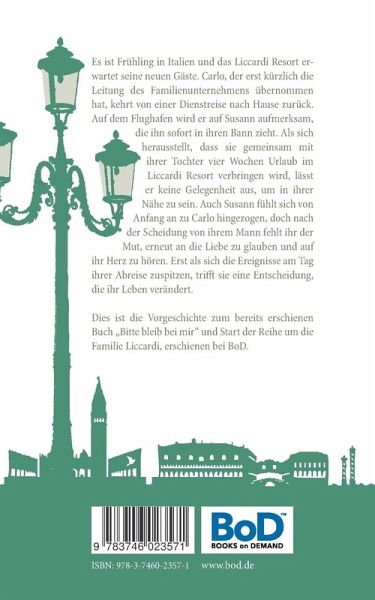 Es ist Frühling in Italien und das Liccardi Resort erwartet seine neuen Gäste. Carlo, der erst kürzlich die Leitung des Familienunternehmens übernommen hat, kehrt von einer Dienstreise nach Hause zurück. Auf dem Flughafen wird er auf Susann aufmerksam, die ihn sofort in ihren Bann zieht. Als sich herausstellt, dass sie gemeinsam mit ihrer Tochter vier Wochen Urlaub im Liccardi Resort verbringen wird, lässt er keine Gelegenheit aus, um in ihrer Nähe zu sein. Auch Susann fühlt sich von Anfang an zu Carlo hingezogen, doch nach der Scheidung von ihrem Mann fehlt ihr der Mut, erneut an die Liebe zu glauben und auf ihr Herz zu hören. Erst als sich die Ereignisse am Tag ihrer Abreise zuspitzen, trifft sie eine Entscheidung, die ihr Leben verändert.Dies ist die Vorgeschichte zum bereits erschienen Buch "Bitte bleib bei mir" und Start der Reihe um die Familie Liccardi, erschienen bei BoD.