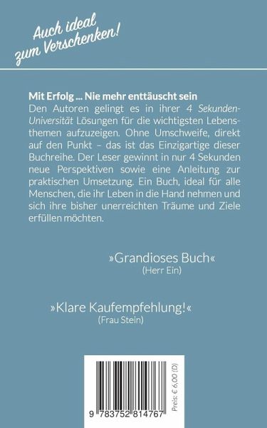 Du suchst ein außergewöhnliches Geschenk für einen Menschen, der leicht enttäuscht ist? Oder dem es in Deinen Augen gut tun würde, entspannter auf Enttäuschungen im Leben zu reagieren? Ohne ihm auf den Schlips zu treten schenkst Du echten Mehrwert mit einem Augenzwinkern. Denn dieser Ratgeber bringt durch den psychlogischen Trick einiger leerer Seiten die Pointe, eine Entscheidung zu treffen, messerscharf auf den Punkt. Der Leser gewinnt somit in nur 4 Sekunden neue Perspektiven sowie eine Anleitung zur praktischen Umsetzung. Das ist das Einzigartige der Ratgeber der 4-Sekunden-Universität. Das Geschenkbuch zaubert nicht nur ein Lächeln auf das Gesicht des Beschenkten, sondern regt zum Nachdenken an und ist ein wunderbares Gesprächsthema.Ein Buch mit Humor und Tiefgang, das Frauen sowie Männern hilft, weniger oft enttäuscht zu sein. Du kannst es zu Anlässen wie Abschieden, Trennungen, Verlusten, Schicksalsschlägen oder Neujahrsvorsätzen verschenken. Oder als aufbauende Geste beziehungsweise kleine Anregung für ein zufriedenes und enttäuschungsfreies Leben.»Grandioses Buch zum Verschenken« (Herr Ein) »Klare Kaufempfehlung!« (Frau Stein)»Potential für einen neuen Bestseller im Bereich erfolgreiche Persönlichkeitsentwicklung, Umgang mit Enttäuschungen, Frustrationstoleranz steigern, Loslassen sowie Veränderungen.« (Herr Ein & Frau Stein)Weitere Geschenkbücher der 4-Sekunden-Universität:Mit Erfolg ... Glücklich sein (ISBN: 9783752822281)Mit Erfolg ... Mit dem Rauchen aufhören (ISBN: 9783752822328)Mit Erfolg ... 11 Kilo in 6 Wochen abnehmen (ISBN: 9783752822335)Mit Erfolg ... Kinder liebevoll erziehen (ISBN: 9783752822397)Mit Erfolg ... Gesund ernähren (ISBN: 9783752822359)