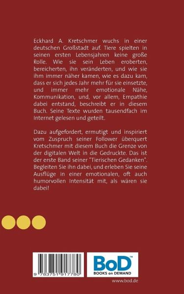 Eckhard A. Kretschmer wuchs in einer deutschen Großstadt auf. Tiere spielten in seinen ersten Lebensjahren keine große Rolle. Wie sie sein Leben eroberten, bereicherten, ihn veränderten, und wie sie ihm immer näher kamen, wie es dazu kam, dass er sich jedes Jahr mehr für sie einsetzte, und immer mehr emotionale Nähe, Kommunikation, und, vor allem, Empathie dabei entstand, beschreibt er in diesem Buch - mit Gefühl. Seine Texte wurden tausendfach im Internet gelesen und geteilt.Dazu aufgefordert, ermutigt und inspiriert vom Zuspruch seiner Follower überquert Kretschmer mit diesem Buch die Grenze von der digitalen Welt in die Gedruckte. Das ist der erste Band seiner "Tierischen Gedanken". Begleiten Sie ihn dabei, und erleben Sie seine Ausflüge in einer emotionalen, oft auch humorvollen Intensität mit, als wären sie dabei!