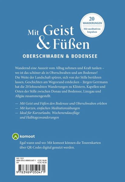 Wandern als Auszeit vom Alltag - wo könnte man das besser genießen als in Oberschwaben und am Bodensee? Jürgen Gerrmann hat 20 besonders lohnenswerte Touren zu Klöstern, Kapellen und Orten der Stille zwischen Donau und Bodensee, Linzgau und Allgäu zusammengestellt. Die Reihe "Mit Geist und Füßen" lädt dazu ein, die Weite der Landschaft zu spüren, von der Stille berührt zu werden und die verborgenen Geschichten der Region zu entdecken. Neu dabei: Zu allen Touren sind GPS-Daten und digitale Wanderkarten bei KOMOOT per QR-Code verfügbar. Die handlichen Bände im Jackentaschenformat sind ideale Begleiter für alle, die eine kleine Auszeit vom Alltag suchen und Kraft in der Natur tanken möchten.> Der einzige Wanderführer zu Orten der Einkehr und Stille in der Region Bodensee-Oberschwaben. > Zum Entschleunigen und Kraft tanken im Alltag.> Mit Tourenvorschlägen, Karten und Tipps für ein nachhaltiges Naturerlebnis.> Ideal für Kurzurlaube, Wochenendausflüge und Halbtagswanderungen.> Im handlichen "Jackentaschenformat".> Neu dabei: GPS-Daten und digitale Wanderkarten bei KOMOOT per QR-Code verfügbar.