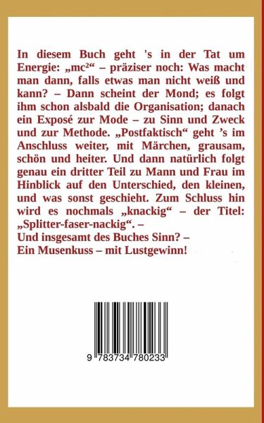 In diesem Buch geht 's in der Tat um Energie: mc², präziser noch: Was macht man dann, falls etwas man nicht weiß und kann? Dann scheint der Mond; es folgt ihm schon alsbald die Organisation; danach ein Exposé zur Mode, zu Sinn und Zweck und zur Methode. Postfaktisch geht 's im Anschluss weiter, mit Märchen, grausam, schön und heiter. Und dann natürlich folgt genau ein dritter Teil zu Mann und Frau im Hinblick auf den Unterschied, den kleinen, und was sonst geschieht. Zum Schluss hin wird es nochmals knackig, der Titel: Splitter-faser-nackig. Und insgesamt des Buches Sinn? Ein Musenkuss mit Lustgewinn!
