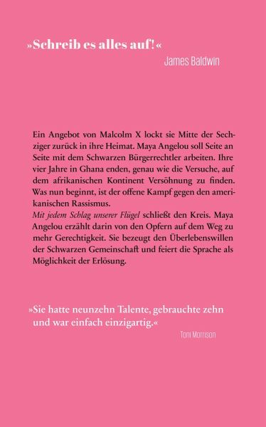 Ein Angebot von Malcolm X lockt sie Mitte der Sechziger zurück in ihre Heimat. Maya Angelou soll Seite an Seite mit dem Schwarzen Bürgerrechtler arbeiten. Ihre vier Jahre in Ghana enden, genau wie die Versuche, auf dem afrikanischen Kontinent Versöhnung zu finden. Was nun beginnt, ist der offene Kampf gegen den Rassismus in den Vereinigten Staaten, mit viel zu vielen Opfern: Malcolm X wird erschossen, im Stadtteil Watts im Süden von Los Angeles kosten Ausschreitungen zahlreichen Schwarzen Menschen das Leben, Martin Luther King stirbt bei einem Attentat ... Aus nächster Nähe berichtet Maya Angelou von den historischen Rückschlägen und der Gewalt, von der Macht eines menschenverachtenden Systems, bis sie ein zweites Mal in ihrem Leben vor Schmerz fast verstummt. James Baldwin ist es, der ihr Sinn und Zweck und Kraft und Schönheit der Worte in Erinnerung ruft und sie bittet, schreib es alles auf.