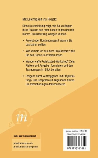 Mit Leichtigkeit ins ProjektDer Einstieg entscheidet über den ProjekterfolgDiese Kurzanleitung zeigt, wie Sie zu Beginn Ihres Projekts den roten Faden finden und mit klarem Projektauftrag loslegen können.-Projekt oder Routineprozess? Warum Sie das klären sollten.-Wie komme ich zu einem Projektteam? Wie Sie das Henne-Ei-Problem lösen.-Wunderwaffe Projektstart-Workshop?Ziele, Risiken und Aufgaben fomulieren und den Teamprozess im Blick behalten.-Freigabe durch Auftraggeber und Projektleitung? Das Gespräch auf Augenhöhe führen. Die Vereinbarungen dokumentieren.InhaltWer ein Projekt anpackt beginnt gedanklich auf der grünen Wiese. Im Gegensatz zu Routineprozessen gibt es bei Projekten keinen beschriebenen Weg, wie das Projekt startet. Deshalb stellt sich immer wieder dieselbe Frage: Wie mache ich den Anfang? Diese Kurzanleitung zeigt eine in der Praxis bewährte Vorgehensweise, wie Sie in wenigen Schritten von der Projektidee zum klaren Projektauftrag kommen.Im Projektmanagement gibt es sehr viele nützliche Hilfsmittel. Wann und wie welche Methode oder Maßnahme zum Einsatz kommt, entscheidet am Ende jeder Projektleiter und jedes Projektteam selbst. Subjektiv und von Projekt zu Projekt unterschiedlich.In unserer Reihe "Quick-Guide" greifen wir einzelne Hilfsmittel aus unserem Projektmanagement-Werkzeugkasten heraus. Damit wollen wir das Lesen dicker Projektmanagement-Literatur ersparen und liefern praxiserprobte Ansätze für Ihren Projektalltag.Projektmensch. Mit Projekten ist mehr möglich als man ahnt.www.projektmensch.com