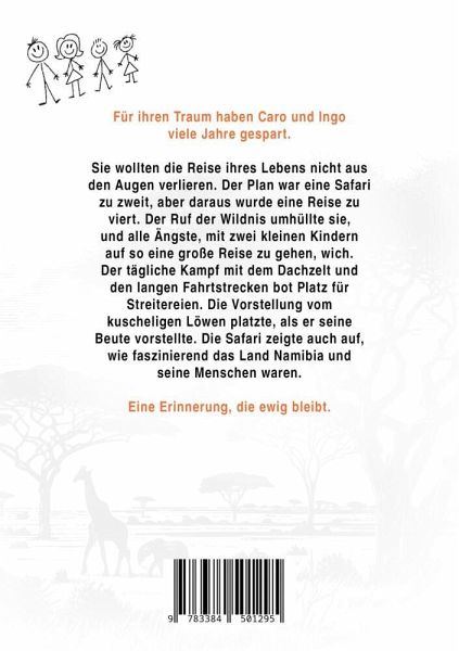 Für ihren Traum haben Caro und Ingo viele Jahre gespart.Sie wollten die Reise ihres Lebens nicht aus den Augen verlieren.Der Plan war eine Safari zu zweit, aber daraus wurde eine Reisezu viert. Der Ruf der Wildnis umhüllte sie, und alle Ängste, mitzwei kleinen Kindern auf so eine große Reise zu gehen, wich.Der tägliche Kampf mit dem Dachzelt und den langen Fahrtstreckenbot Platz für Streitereien. Die Vorstellung vom kuscheligenLöwen platzte, als er seine Beute vorstellte. Die Safari zeigte auch auf,wie faszinierend das Land Namibia und seine Menschen waren.