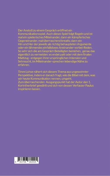 Der Anstoß zu einem Gespräch eröffnet ein Kommunikationsspiel. Auch dieses Spiel folgt Regeln und ist mal ein spielerisches Miteinander, dann ein kämpferisches Gegeneinander, mal überraschend kreativ, dann ein Hin und Her der jeweils als richtig behaupteten Argumente oder ein lähmendes einfallsloses Aneinander-vorbei-Reden.So sehr sich die am Gespräch Beteiligten bemühen, genau das eigentlich zu vermeiden: es endet patt oder mit dem finalen Mattzug - entgegen ihrer ursprünglichen Intension und Sehnsucht, im Miteinander-sprechen lebendige Nähe zu erfahren.Timm Lohse nähert sich diesem Thema aus ungewohnter Perspektive, indem er danach fragt, wie die Bibel mit dem, was wir heute Kommunikation nennen, umgeht.Zum überraschenden Ausgangspunkt hat der Autor den 1. Korintherbrief gewählt und sich von dessen Verfasser Paulus inspirieren lassen.
