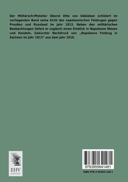 Der Militärschriftsteller Oberst Otto von Odeleben schildert im vorliegenden Band seine Sicht des napoleonischen Feldzuges gegen Preußen und Russland im Jahr 1813. Neben den militärischen Beobachtungen liefert er zugleich einen Einblick in Napoleons Wesen und Handeln. Gekürzter Nachdruck von Napoleons Feldzug in Sachsen im Jahr 1813 aus dem Jahr 1910.