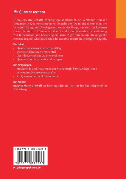 Dieses essential schafft lebendig und anschaulich ein Verständnis für die Vorgänge in Quantencomputern. Es geht den Quantenphänomenen der Verschränkung und Überlagerung sowie der Frage, wie sie zum Rechnen verwendet werden können, auf den Grund. Gezeigt werden die Kodierung von Information, die Erklärung einfacher Algorithmen und die mögliche Anwendung. Ein Glossar am Ende des essentials erklärt die wichtigsten Begriffe.