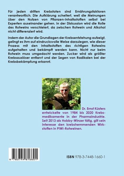 Für jeden dritten Krebstoten sind Ernährungsfaktoren verantwortlich. Die Aufklärung scheitert, weil die Meinungen über den Nutzen von Pflanzen-Inhaltsstoffen selbst bei Experten auseinander gehen. In der Diskussion wird die Rolle des Rotweins verschleiert, da zwischen Rotwein und Alkohol nicht differenziert wird.Indem der Autor die Grundlagen der Krebsentstehung aufzeigt, gelingt es ihm auf eindrucksvolle Weise darzulegen, wie dieser Prozess mit den Inhaltsstoffen des richtigen Rotweins aufgehalten und bekämpft werden kann. Nicht nur beim Rotwein muss umgedacht werden. Zucker wird als größter Krebsauslöser entlarvt und der Segen von Radikalen bei der Krebsbekämpfung erkannt.