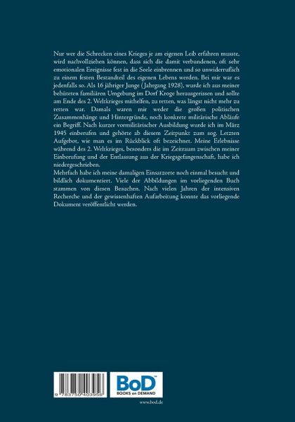 Nur wer die Schrecken eines Krieges je am eigenen Leib erfahren musste, wird nachvollziehen können, dass sich die damit verbundenen, oft sehr emotionalen Ereignisse fest in die Seele einbrennen und so unwiderruflich zu einem festen Bestandteil des eigenen Lebens werden. Bei mir war es jedenfalls so. Als 16 jähriger Junge (Jahrgang 1928), wurde ich aus meiner behüteten familiären Umgebung im Dorf Kroge herausgerissen und sollte am Ende des 2. Weltkrieges mithelfen, zu retten, was längst nicht mehr zu retten war. Damals waren mir weder die großen politischen Zusammenhänge und Hintergründe, noch konkrete militärische Abläufe ein Begriff. Nach kurzer vormilitärischer Ausbildung wurde ich im März 1945 einberufen und gehörte ab diesem Zeitpunkt zum sog. Letzten Aufgebot, wie man es im Rückblick oft bezeichnet. Meine Erlebnisse während des 2. Weltkrieges, besonders die im Zeitraum zwischen meiner Einberufung und der Entlassung aus der Kriegsgefangenschaft, habe ich niedergeschrieben. Mehrfach habe ich meine damaligen Einsatzorte noch einmal besucht und bildlich dokumentiert. Viele der Abbildungen im vorliegenden Buch stammen von diesen Besuchen. Nach vielen Jahren der intensiven Recherche und der gewissenhaften Aufarbeitung konnte das vorliegende Dokument veröffentlicht werden.