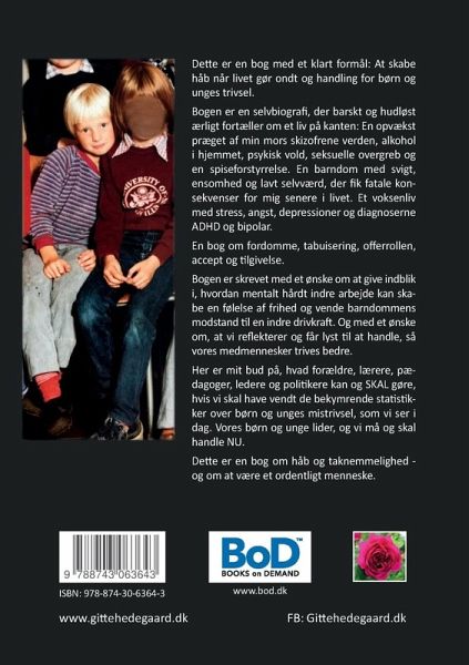Dette er en bog med et klart formål: At skabe håb når livet gør ondt og handling for børn og unges trivsel. Bogen er en selvbiografi, der barskt og hudløst ærligt fortæller om et liv på kanten: En opvækst præget af min mors skizofrene verden, alkohol i hjemmet, psykisk vold, seksuelle overgreb og en spiseforstyrrelse. En barndom med svigt, ensomhed og lavt selvværd, der fik fatale konsekvenser for mig senere i livet. Et voksenliv med stress, angst, depressioner og diagnoserne ADHD og bipolar. En bog om fordomme, tabuisering, offerrollen, accept og tilgivelse. Bogen er skrevet med et ønske om at give indblik i, hvordan mentalt hårdt indre arbejde kan skabe en følelse af frihed og vende barndommens modstand til en indre drivkraft. Og med et ønske om, at vi reflekterer og får lyst til at handle, så vores medmennesker trives bedre. Her er mit bud på, hvad forældre, lærere, pædagoger, ledere og politikere kan og SKAL gøre, hvis vi skal have vendt de bekymrende statistikker over børn og unges mistrivsel, som vi ser i dag. Vores børn og unge lider, og vi må og skal handle NU. Dette er en bog om håb og taknemmelighed - og om at være et ordentligt menneske.