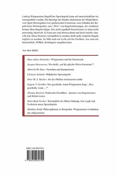 Frontmatter -- Inhaltsverzeichnis -- Vorwort -- Wittgenstein und die Grammatik -- Was heißt "auf die gleiche Weise fortsetzen"? -- Verstehen und Interpretieren -- "Jedes Zeichen kann zum Lügen verwendet werden" -- Als das Pfeifen verstummen mußte -- Was geschieht, wenn Wittgenstein fragt: "Was geschieht, wenn ... ?" -- Praktische Gewißheit - jenseits von Dogmatismus und Relativismus -- Rationalität als offene Ordnung. Zur Logik und Evolution neuer Sprachspiele -- Philosophieren in Beispielen. Wittgensteins Umdenken des Allgemeinen -- Anhang -- Literaturverzeichnis -- Zu den Autoren -- Personenregister