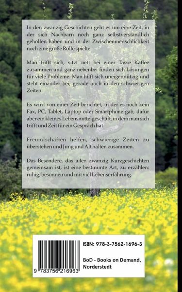 In den zwanzig Geschichten geht es um eine Zeit, in der sich Nachbarn noch ganz selbstverständlich geholfen haben und in der Zwischenmenschlichkeit noch eine große Rolle spielte. Man trifft sich, sitzt nett bei einer Tasse Kaffee zusammen und ganz nebenbei finden sich Lösungen für viele Probleme. Man hilft sich uneigennützig und steht einander bei, gerade auch in den schwierigen Zeiten.Es wird von einer Zeit berichtet, in der es noch kein Fax, PC, Tablet, Laptop oder Smartphone gab, dafür aber ein kleines Lebensmittelgeschäft, in dem man sich trifft und Zeit für ein Gespräch hat.Freundschaften…mehr