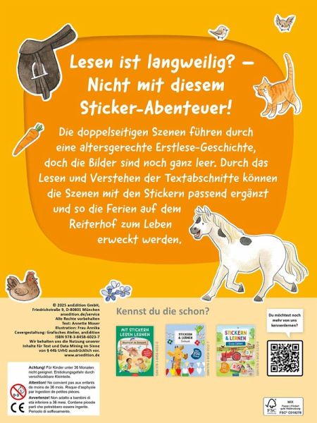 Lesen ist langweilig? - Nicht mit diesem Sticker-Abenteuer! Die doppelseitigen Szenen führen durch eine altersgerechte Erstlese-Geschichte, doch die Bilder sind noch ganz leer. Durch das Lesen und Verstehen der Textabschnitte kann die Szene mit den Stickern passend ergänzt und so das Reiterhof-Abenteuer zum Leben erweckt werden.