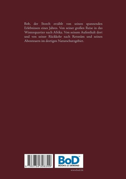Bob, der Storch erzählt von seinen spannenden Erlebnissen eines Jahres. Von seiner großen Reise in das Winterquartier nach Afrika. Von seinem Aufenthalt dort und von seiner Rückkehr nach Retsnüm und seinen Abenteuern im dortigen Naturschutzgebiet.