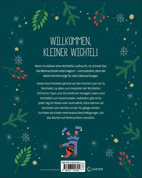 Wenn im Advent eine Wichteltür auftaucht, ist schnell klar: Die Weihnachtszeit wird magisch - und turbulent, denn der kleine Wichtel sorgt für viele Überraschungen. Dieses Buch bereitet optimal auf den frechen Gast vor. Es beinhaltet 24 Ideen zum Bespielen der Wichteltür, hilfreiche Tipps und Wichtelbrief-Vorlagen sowie eine Wichteltür zum Ausschneiden. Außerdem gibt es für jeden Tag ein Rätsel oder Ausmalbild. Diese können als Geschenk vom Wichtel vor die Tür gelegt werden. So finden die Kinder viele kreative Beschäftigungen, die das Warten auf Weihnachten versüßen.