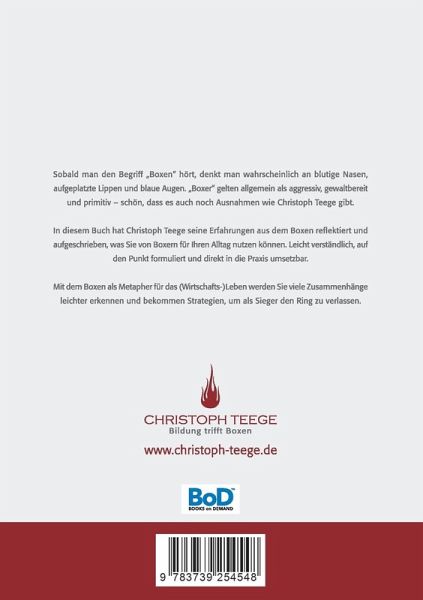 Sobald man den Begriff "Boxen" hört, denkt man wahrscheinlich an blutige Nasen, aufgeplatzte Lippen und blaue Augen. "Boxer" gelten allgemein als aggressiv, gewaltbereit und primitiv - schön, dass es noch Ausnahmen gibt. In diesem Buch hat Christoph Teege seine Erfahrungen aus dem Boxen reflektiert und aufgeschrieben, was Sie von Boxern für Ihren Alltag nutzen können. Leicht verständlich, auf den Punkt formuliert und direkt in die Praxis umsetzbar. Mit dem Boxen als Metapher für das (Wirtschafts-)Leben werden Sie viele Zusammenhänge leichter erkennen und haben das mentale Rüstzeug, um als Sieger den Ring zu verlassen.