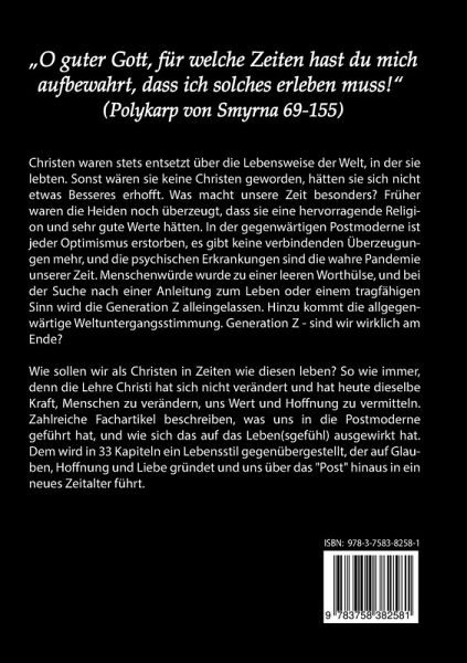 Christen waren stets entsetzt über die Lebensweise der Welt, in der sie lebten. Sonst wären sie keine Christen geworden, hätten sie sich nicht etwas Besseres erhofft. Was macht unsere Zeit besonders? Früher waren die Heiden noch überzeugt, dass sie eine hervorragende Religion und sehr gute Werte hätten. In der gegenwärtigen Postmoderne ist jeder Optimismus erstorben, es gibt keine verbindenden Überzeugungen mehr, und die psychischen Erkrankungen sind die wahre Pandemie unserer Zeit. Menschenwürde wurde zu einer leeren Worthülse, und bei der Suche nach einer Anleitung zum Leben oder einem tragfähigen Sinn wird die Generation Z alleingelassen. Hinzu kommt die allgegenwärtige Weltuntergangsstimmung. Generation Z - sind wir wirklich am Ende?Wie sollen wir als Christen in Zeiten wie diesen leben? So wie immer, denn die Lehre Christi hat sich nicht verändert und hat heute dieselbe Kraft, Menschen zu verändern, uns Wert und Hoffnung zu vermitteln. Zahlreiche Fachartikel beschreiben, wasuns in die Postmoderne geführt hat, und wie sich das auf das Leben(sgefühl) ausgewirkt hat. Dem wird in 33 Kapiteln ein Lebensstil gegenübergestellt, der auf Glauben, Hoffnung und Liebe gründet und uns über das "Post" hinaus in ein neues Zeitalter führt.