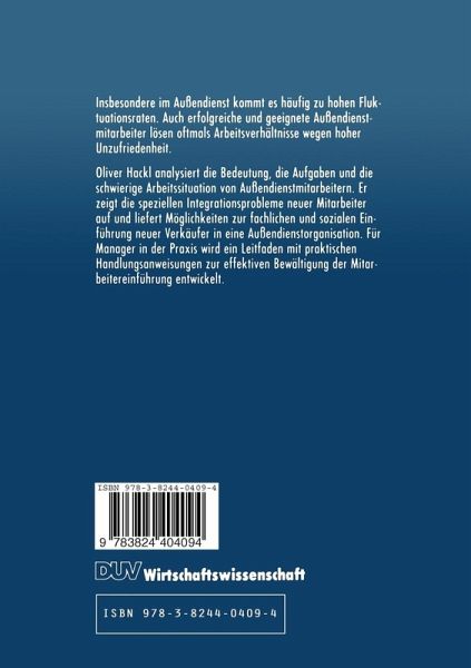 Insbesondere im Außendienst kommt es häufig zu hohen Fluktuationsraten. Auch erfolgreiche und geeignete Außendienstmitarbeiter lösen oftmals Arbeitsverhältnisse wegen hoher Unzufriedenheit. Oliver Hackl analysiert die Bedeutung, die Aufgaben und die schwierige Arbeitssituation von Außendienstmitarbeitern. Er zeigt die speziellen Integrationsprobleme neuer Mitarbeiter auf und liefert Möglichkeiten zur fachlichen und sozialen Einführung neuer Verkäufer in eine Außendienstorganisation. Für Manager in der Praxis wird ein Leitfaden mit praktischen Handlungsanweisungen zur effektiven Bewältigung der Mitarbeitereinführung entwickelt.