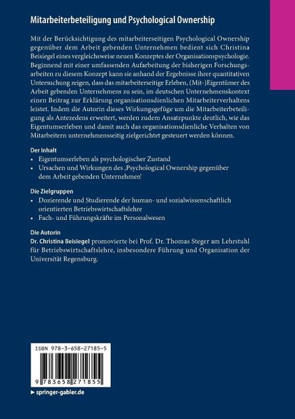 Mit der Berücksichtigung des mitarbeiterseitigen Psychological Ownership gegenüber dem Arbeit gebenden Unternehmen bedient sich Christina Beisiegel eines vergleichsweise neuen Konzeptes der Organisationspsychologie. Beginnend mit einer umfassenden Aufarbeitung der bisherigen Forschungsarbeiten zu diesem Konzept kann sie anhand der Ergebnisse ihrer quantitativen Untersuchung zeigen, dass das mitarbeiterseitige Erleben, (Mit-)Eigentümer des Arbeit gebenden Unternehmens zu sein, im deutschen Unternehmenskontext einen Beitrag zur Erklärung organisationsdienlichen Mitarbeiterverhaltens leistet. Indem die Autorin dieses Wirkungsgefüge um die Mitarbeiterbeteiligung als Antezedens erweitert, werden zudem Ansatzpunkte deutlich, wie das Eigentumserleben und damit auch das organisationsdienliche Verhalten von Mitarbeitern unternehmensseitig zielgerichtet gesteuert werden können.