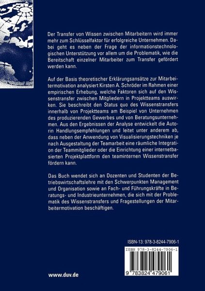 Auf der Basis theoretischer Erklärungsansätze zur Mitarbeitermotivation analysiert Kirsten A. Schröder im Rahmen einer empirischen Erhebung, welche Faktoren sich auf den Wissenstransfer zwischen Mitgliedern in Projektteams auswirken. Sie beschreibt den Status quo des Wissenstransfers innerhalb von Projektteams am Beispiel von Unternehmen des produzierenden Gewerbes und von Beratungsunternehmen. Aus den Ergebnissen der Analyse entwickelt die Autorin Handlungsempfehlungen und leitet unter anderem ab, dass neben der Anwendung von Visualisierungstechniken je nach Ausgestaltung der Teamarbeit eine räumliche Integration der Teammitglieder oder die Einrichtung einer internetbasierten Projektplattform den teaminternen Wissenstransfer fördern kann.