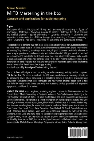 More than 500 pages on audio mastering with hundreds of examples, online media, tests, activities, etc. This book deals with digital sound processing for audio mastering, entirely inside a computer, ITB, In the Box.
