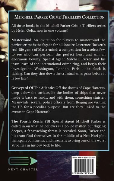 All three books in the Mitchell Parker Crime Thrillers series by Helen Goltz, now in one volume! Mastermind: A website inviting players to mastermind the perfect crime is the façade for billionaire Lawrence Hackett's real-life game of Mastermind - an invitation-only competition for a select few - to see who can perform the perfect heist and win an enormous bounty. Special Agent Mitchell Parker and his team learn of the international crime ring, and begin their investigation. Washington, London, Paris - the clock is ticking. Can Parker and his team shut down the criminal enterprise before it is too late? Graveyard Of The Atlantic: Off the shores of Cape Hatteras, deep below the surface, lie the bodies of ships that never made it back to land... and with them, something silent and sinister. Meanwhile, several police officers from Beijing are visiting the US for a peculiar purpose. But are they linked to the events in Cape Hatteras? It will be a rough ride for Mitchell and his team, as they race against the ocean - and the clock - to solve the mystery. The Fourth Reich: FBI Special Agent Mitchell Parker is frustrated to be called in on what he believes is a police matter, but digging deeper, a much more far-reaching threat is revealed. Soon, Parker and his team find themselves in the middle of a Neo-Nazi plot that spans continents, and threatens to bring one of the worst atrocities in history back to life.