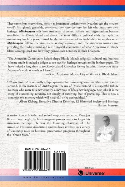 They came from everywhere, mostly as immigrant orphans who lived through the modern world's first ghastly genocide, convinced they were the very few left who must save their heritage. Mitchnapert tells how Armenian churches, schools and organizations became established in Rhode Island and about the most difficult political crisis that split the community for fifty years, caused by the assassination of an Archbishop in another state. Mitchnapert follows the Armenians as they assimilate into the American mainstream, providing the reader a lucid and rare historical examination of what Armenians in Rhode Island accomplished and how they gained such notoriety in their Diaspora. The "street stories" and historical essays of past events provide much factual evidence and familiarity to those who lived through the more recent periods. The early business scene and descriptions of neighborhoods where Armenians lived are recounted. Complex issues of how they are surviving the ethnic "melting pot" syndrome, both present and in the future are examined as second and third generation Armenian Americans become the community's new decision makers. Included is a "Who's Who" cross-section of Armenians who live and work in the state and those who moved elsewhere but still retain their Rhode Island roots.