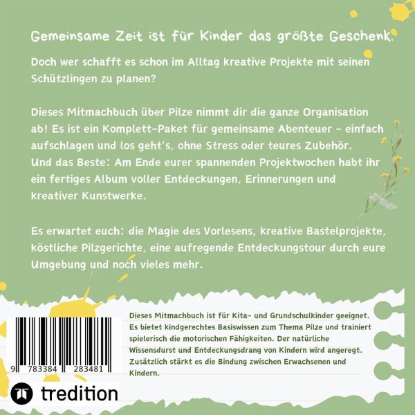 Gemeinsame Zeit ist für Kinder das größte Geschenk. Doch wer schafft es schon im Alltag kreative Projekte mit seinenSchützlingen zu planen?Dieses Mitmachbuch über Pilze nimmt dir die ganze Organisation ab! Es ist ein Komplett-Paket für gemeinsame Abenteuer - einfachaufschlagen und los geht's, ohne Stress oder teures Zubehör. Und das Beste: Am Ende eurer spannenden Projektwochen habt ihrein fertiges Album voller Entdeckungen, Erinnerungen und kreativer Kunstwerke.Es erwartet euch: die Magie des Vorlesens, kreative Bastelprojekte, köstliche Pilzgerichte, eine aufregende Entdeckungstour durch eureUmgebung und noch vieles mehr.
