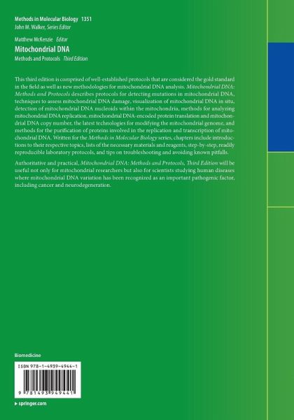 Authoritative and practical, Mitochondrial DNA: Methods and Protocols, Third Edition will be useful not only for mitochondrial researchers but also for scientists studying human diseases where mitochondrial DNA variation has been recognized as an important pathogenic factor, including cancer and neurodegeneration.