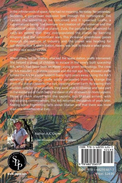 In the infinite voids of space, time had no meaning. No today. No yesterday. Suddenly, a gargantuan explosion tore through this nothingness. This caused the universe to be conceived and it spawned Leaffe, a supernatural being. She oversaw the creation of the universe and the creation of planets. On one planet, Zula, the people had advanced to such an extent that they overpopulated the planet by banning religions and the concomitant wars. This increased greenhouse gasses through the overuse of industry and the planet was heading for self-destruction. A space station, Haven, was built to house a select group, so their race would survive. When aliens, led by Shaitan, attacked the space station, Leaffe intervened. She helped a group of children to escape in the newly built spaceship Ark, which had been built on Haven using green technology. The crew on Ark travelled in D-stasis cocoons and did not age. This allowed Leaffe to take the Ark to a solar system many light-years away. Using the Ark's advanced technology, Leaffe subtly persuaded them to change the orbit of a planet closer to the sun, creating planet Earth. By leaving their cocoons only for short periods, they were able to observe and take part in the evolution of Earth from the dawn of the dinosaurs to Homo sapiens. Three of them stayed with the sapiens, but Shaitan arrived, with devastating consequences. The Ark returned thousands of years later, finding some frightening facts about Shaitan and that there was more than one Mitochondrial Eve.