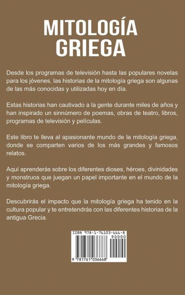 Mitología Griega Desde los programas de televisión hasta las populares novelas para los jóvenes, las historias de la mitología griega son algunas de las más conocidas y utilizadas hoy en día. Estas historias han cautivado a la gente durante miles de años y han inspirado un sinnúmero de poemas, obras de teatro, libros, programas de televisión y películas. Este libro te lleva al apasionante mundo de la mitología griega, donde se comparten varios de los más grandes y famosos relatos. Aquí aprenderás sobre los diferentes dioses, héroes, divinidades y monstruos que juegan un papel importante en el mundo de la mitología griega. Descubrirás el impacto que la mitología griega ha tenido en la cultura popular y te entretendrás con las diferentes historias de la antigua Grecia. He aquí todo sobre lo que vas a aprender... Qué es la Mitología Griega Los varios dioses, héroes y monstruos Los mitos más importantes La guerra de Troya Hércules y sus 12 Trabajos Procne y Filomela La caja de Pandora La Odisea de Homero El legado de los Griegos ¡Y mucho, mucho más!