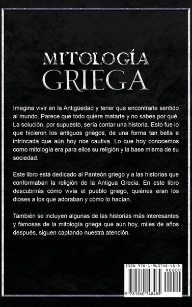 Mitología Griega Imagina vivir en la Antigüedad y tener que encontrarle sentido al mundo. Parece que todo quiere matarte y no sabes por qué. La solución, por supuesto, sería contar una historia. Esto fue lo que hicieron los antiguos griegos, de una forma tan bella e intrincada que aún hoy nos cautiva. Lo que hoy conocemos como mitología era para ellos su religión y la base misma de su sociedad. Este libro está dedicado al Panteón griego y a las historias que conformaban la religión de la Antigua Grecia. En este libro descubrirás cómo vivía el pueblo griego, quiénes eran los dioses a los que adoraban y cómo lo hacían. También se incluyen algunas de las historias más interesantes y famosas de la mitología griega que aún hoy, miles de años después, captan nuestra atención. ¿Listo para sumergirte en el Panteón Griego? Desplácese hacia arriba y haga clic en "Comprar ahora" para hacerse con este libro hoy mismo.