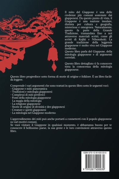 QUANTO SAPPIAMO DELLA MITOLOGIA GIAPPONESE? LE UNICHE NOZIONI CHE CONOSCIAMO SONO QUELLE APPRESE A SCUOLA... MA C'È TUTTO UN MONDO NASCOSTO DA SCOPRIRE, GRANDI LEGGENDE E RACCONTI SPAVENTOSI DI MITI E DEMONI MAI RACCONTATI CHE TI IMMERGERANNO DAVVERO NELLA VERA CULTURA GIAPPONESE! Il mito del Giappone è una delle credenze più comuni detenute dai giapponesi. In questa visione, il Giappone è una nazione insulare, distinta in termini di cultura e geografia, misteriosa e omogenea. Naturalmente, questo fa parte della Grande Tradizione, tramandataci attraverso materiali scritti, come gli scritti Kojiki e Nihonshoki. La Grande Tradizione della leggenda giapponese è molto viva nel Giappone moderno. Questo libro parla del Giappone, della mitologia giapponese e di argomenti correlati. Questo libro dettagliato ti fa conoscere tutta la conoscenza della mitologia giapponese. Questo libro procede sotto forma di storie di origine e folklore. È un libro facile da leggere. Questo libro comprende vari argomenti che sono trattati in questo libro sotto i seguenti titoli: ¿ Giappone e miti: panoramica ¿ Tradizioni e mitologia giapponesi ¿ Complessi mitici periferici ¿ Fonti della mitologia giapponese ¿ La magia della mitologia ¿ La religione giapponese ¿ Storie di origine di dei e dee giapponesi ¿ Creature e spiriti giapponesi ¿ Mitologia nel Giappone moderno Questo libro è interessante se sei nuovo nella mitologia giapponese. Imparare a conoscere i miti può anche portarti a entrare in contatto con il popolo giapponese su vari motivi comuni. Se vuoi visitare il Giappone in qualsiasi momento presto, è abbastanza buono per te conoscere il bellissimo paese, la sua gente e le loro convinzioni attraverso questo libro.Allora, cosa stai aspettando?Approfitta di questa opportunità e prendi subito la tua copia.