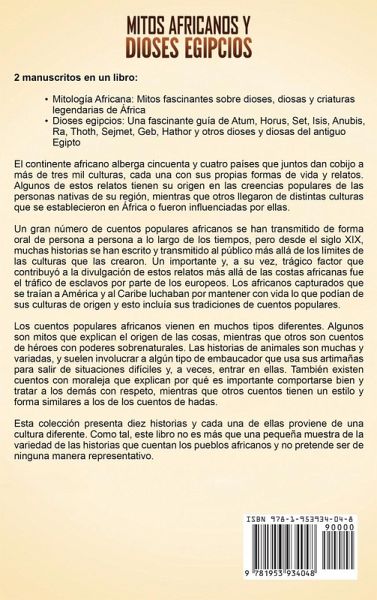 Dos manuscritos en un libroMitología africana: Mitos fascinantes sobre dioses, diosas y criaturas legendarias de África Dioses egipcios: Una fascinante guía de Atum, Horus, Set, Isis, Anubis, Ra, Thoth, Sejmet, Geb, Hathor y otros dioses y diosas del antiguo Egipto El continente africano alberga cincuenta y cuatro países que juntos dan cobijo a más de tres mil culturas, cada una con sus propias formas de vida y relatos. Algunos de estos relatos tienen su origen en las creencias populares de las personas nativas de su región, mientras que otros llegaron de distintas culturas que se establecieron en África o fueron influenciadas por ellas. Un gran número de cuentos populares africanos se han transmitido de forma oral de persona a persona a lo largo de los tiempos, pero desde el siglo XIX, muchos relatos se han escrito y transmitido al público más allá de los límites de las culturas que las crearon. Un importante y, a su vez, trágico factor que contribuyó a la divulgación de estos relatos más allá de las costas africanas fue el tráfico de esclavos por parte de los europeos. Los africanos capturados que se traían a América y al Caribe luchaban por mantener con vida lo que podían de sus culturas de origen y esto incluía sus tradiciones de cuentos populares. Los cuentos populares africanos vienen en muchas formas diferentes. Algunos son mitos que explican el origen de las cosas, mientras que otros son cuentos de héroes con poderes sobrenaturales. Las historias de animales son muchas y variadas, y suelen involucrar a algún tipo de embaucador que usa sus artimañas para salir de situaciones difíciles y, a veces, entrar en ellas. También existen cuentos con moraleja que explican por qué es importante comportarse bien y tratar a los demás con respeto, mientras que otros cuentos tienen un estilo y forma similares a los de los cuentos de hadas. Algunos de los temas y preguntas cubiertos en la primera parte de este libro incluyenLos animales embaucadores Cuentos de héroes Cuentos con moraleja La influencia del islam ¡Y mucho más! Algunos de los temas y preguntas cubiertos en la segunda parte de este libro incluyen:Amón (Ammón, Hámm¿n) Anubis (Anpu, Inpw) Atón (Aten, Atonu) Atum (Tum, Tem, Atem, Temu) Bastet (Bast, Boubastis, Pasht) El Libro de los Muertos y otros textos funerarios Los cuatro hijos de Horus Geb (Seb, Keb, Kebb, Gebb) Hapi (Hapy) Hathor Horus (Hor, Her, Heru, Har) Imhotep (Imouthes) Isis Khnum (Chnum) Jonsu (Khons, Chons) Maat (Ma'at, Ma'et, Mayet) Nefertum (Nefertem) Neit (Neith) Neftis (Nebt-het) Nun (Noun, Nu) El Ogdóada de Hermópolis Osiris Ptah Ra (Re, Pre) Serapis (Sarapis, Userhapi) Set (Seth, Sutekh) Sobek (Suchos) Thoth ¡Y más! ¡Adquiera este libro ahora para aprender más sobre Mitología africana y dioses egipcios!