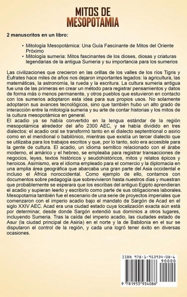 Dos manuscritos en un libroMitología Mesopotámica: Una Guía Fascinante de Mitos del Oriente Próximo Mitología sumeria: Mitos fascinantes de los dioses, diosas y criaturas legendarias de la antigua Sumeria y su importancia para los sumerios Las civilizaciones que se desarrollaron en los valles de los ríos Tigris y Éufrates hace miles de años nos dejaron unos legados importantes: la agricultura, las matemáticas, la astronomía, la rueda y la escritura. El presente volumen de mitos mesopotámicos se divide en tres secciones. La primera de ellas contiene mitos sobre la creación, el más extendido de los cuales es el Enuma Elish, o el relato babilónico de la creación. En este mito, el dios Marduk se enfrenta en batalla contra la dragona Tiamat y crea el mundo a partir del cuerpo de esta y del de su segundo al mando. La historia de Atrahasis no tiene que ver con la creación, sino con la re-creación, ya que se trata del mito de la Gran Inundación enviada por los dioses para arrasar con todo. El buen Atrahasis se salva gracias a la intervención del dios Enki, que avisa a Atrahasis y le manda construir el arca que le salvará a él, a su familia y a los animales. La historia de Etana tiene una naturaleza menos cósmica que las dos anteriores, ya que el acto de la creación que se narra en este relato es el intento de Etana de tener un hijo, y por lo tanto, un heredero al trono. Las hazañas y debilidades de los dioses mesopotámicos aparecen reflejadas en la segunda sección, en historias que nos hablan del carácter de cada una de estas divinidades y que contienen temas que nos aportan datos sobre los conceptos mesopotámicos acerca del orden cósmico. En la primera historia, la diosa Ishtar decide visitar el Inframundo, donde la diosa Ereshkigal ejerce su dominio. Cuando Ereshkigal se preocupa porque la diosa Ishtar pueda suplantarla, prepara una trampa para mantener a Ishtar presa hasta que es rescatada. El acto de Ereshkigal tiene implicaciones cósmicas, ya que Ishtar es una diosa de la fertilidad y, por lo tanto, su confinamiento implica que se suspende toda procreación en la Tierra. Ereshkigal también es una figura destacada en la siguiente historia, la cual relata cómo Nergal, dios de la guerra y la pestilencia, llega a ser su consorte. Nergal rechaza con éxito todos los halagos que Ereshkigal le brinda, excepto la tentación de su cuerpo. El orden divino y el orden natural son temas que también aparecen en los dos últimos relatos de esta sección. En el primero, el dios-héroe Ninurta lleva a cabo su trabajo de restauración del orden divino cuando derrota al ave Anzu, la cual ha robado las Tablillas del Destino de Enlil, mientras que el mito de Adapa sirve como una historia sobre el origen de las cosas para explicar por qué los humanos no son inmortales. Algunos de los temas y preguntas cubiertos en la primera parte de este libro incluyenMitos sobre la Creación Historias sobre dioses y diosas Selecciones de la Épica de Gilgamesh ¡Y mucho, mucho más! Algunos de los temas y preguntas cubiertos en la segunda parte de este libro incluyen:Cuentos de dioses y diosas Cuentos de reyes y héroes Inanna y el árbol Huluppu ¡Y mucho, mucho más! ¡Adquiera este libro ahora para aprender más sobre Mitología Mesopotámica y la mitología sumeria!