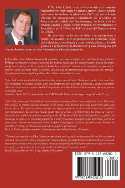 Lott acaba con un falso mito sobre la posesión de armas de fuego uno tras otro! Como señala el Prólogo de Andrew Pollack; "Conozca los hechos reales que los desacreditan". Desde los mitos sobre los tiroteos públicos masivos hasta los suicidios, las tasas de posesión de armas y el crimen hasta las zonas libres de armas, Lott aborda las afirmaciones que escuchas con frecuencia en los medios y explica qué hay de malo en esas afirmaciones. "John Lott nos ha estado dando los hechos sobre armas para décadas. Finalmente, quedó claro para todos que un partido en Estados Unidos tiene una plataforma anti-Segunda Enmienda y quiere desarmarte. Ahora necesitas armarte con la verdad. Compra y lee los mitos del control de armas hoy. Antes de que sea demasiado tarde." Sebastian Gorka Ph.D., presentador de AMERICAN First, ex estratega del presidente Trump "John Lott muestra que los medios de comunicación y muchos políticos tienen prejuicios contra las armas. Por ejemplo, se escriben muchas historias en los medios sobre tiroteos, pero muy pocas sobre defensivas uso de armas. De manera similar, muestra que algunas políticas de control de armas son en realidad contraproducentes. Los asesinos buscan zonas libres de armas. Si prohibiéramos las armas de "asalto", éstos podrían cambiar a armas de caza más grandes. El libro está lleno de análisis estadístico y gráfico, de modo que sus puntos se entiendan fácilmente y sean persuasivos. Cualquiera que defienda el control de armas y no considere seriamente el trabajo de John es negligente. Cualquier periodista que al menos no considere el trabajo de John está cometiendo negligencia periodística." Paul H. Rubin, profesor emérito de economía en Dobbs, Emory University "Tenemos que agradecer a John Lott por proporcionar una vez más una investigación basada en hechos y empírica para contrarrestar la campaña bien financiada y organizada del movimiento contra las armas de fuego basada en nada más que eslóganes, mitos y propaganda diseñada para demonizar a los partidarios de nuestro preciado derecho de la Segunda Enmienda a poseer y portar armas." David Clarke, Sheriff (Ret) Condado de Milwaukee