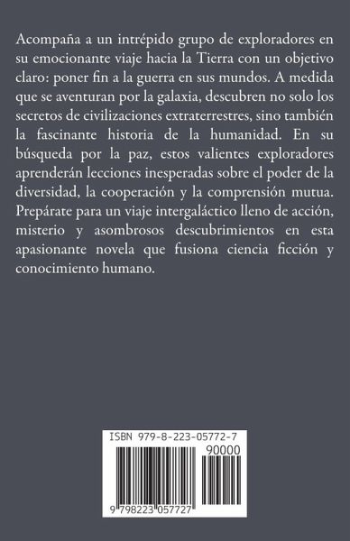 Acompaña a un intrépido grupo de exploradores en su emocionante viaje hacia la Tierra con un objetivo claro: poner fin a la guerra en sus mundos. A medida que se aventuran por la galaxia, descubren no solo los secretos de civilizaciones extraterrestres, sino también la fascinante historia de la humanidad. En su búsqueda por la paz, estos valientes exploradores aprenderán lecciones inesperadas sobre el poder de la diversidad, la cooperación y la comprensión mutua. Prepárate para un viaje intergaláctico lleno de acción, misterio y asombrosos descubrimientos en esta apasionante novela que fusiona ciencia ficción y conocimiento humano.
