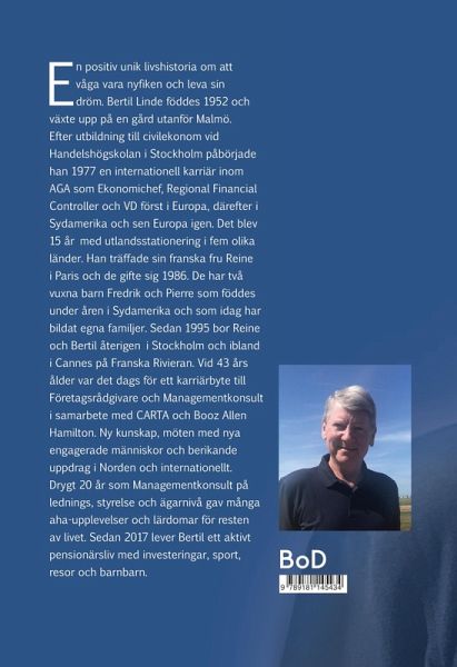 En positiv unik livshistoria om att våga vara nyfiken och leva sin dröm. Bertil Linde föddes 1952 och växte upp på en gård utanför Malmö. Efter utbildning till civilekonom vid Handelshögskolan i Stockholm påbörjade han 1977 en internationell karriär inom AGA som Ekonomichef, Regional Financial Controller och VD först i Europa, därefter i Sydamerika och sen Europa igen. Det blev 15 år med utlandsstationering i fem olika länder. Han träffade sin franska fru Reine i Paris och de gifte sig 1986. De har två vuxna barn Fredrik och Pierre som föddes under åren i Sydamerika och som idag har bildat egna familjer. Sedan 1995 bor Reine och Bertil återigen i Stockholm och ibland i Cannes på Franska Rivieran. Vid 43 års ålder var det dags för ett karriärbyte till Företagsrådgivare och Managementkonsult i samarbete med CARTA och Booz Allen Hamilton. Ny kunskap, möten med nya engagerade människor och berikande uppdrag i Norden och internationellt. Drygt 20 år som Managementkonsult på lednings, styrelse och ägarnivå gav många aha-upplevelser och lärdomar för resten av livet. Sedan 2017 lever Bertil ett aktivt pensionärsliv med investeringar, sport, resor och barnbarn.